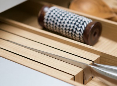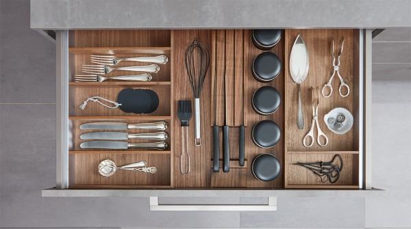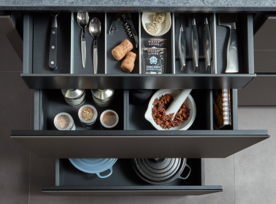 De echte waarden van een keuken blijken bij het nauwkeuriger inspecteren ervan. Bijvoorbeeld als de laden geruisloos en lichtlopend kunnen worden geopend en fluisterstil gedempt, de interieurindeling die uitnodigt tot aanraken en netjes op te bergen.